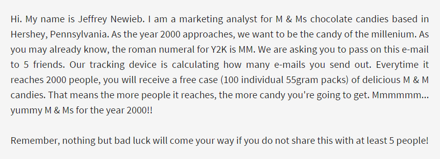 And no, Apple is not giving away free laptops, and Applebee’s will not send you a $50 gift certificate if you pass along their chain letter. Nor Honda, nor M&M candy: