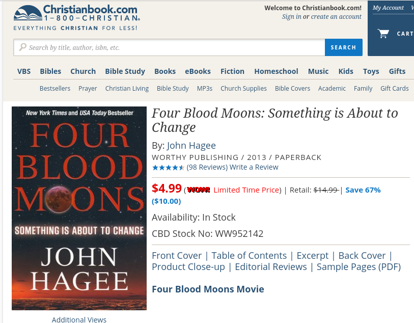 Now: if a Prophecy Expert publishes one book, and it becomes a hit, he will follow it up: multiple sequels, videos, cds. So, while I’m at it, let’s see: Yes, indeed, it looks like all the Blood Moon and Shemitah merchandise is on sale!