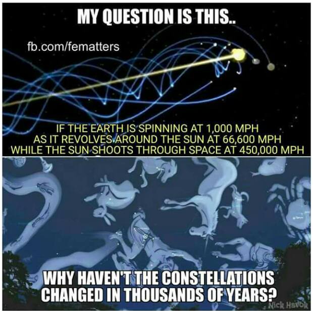 Just for one example, here is a meme I ran into this week, one which “proves absolutely” that the world is flat and the center of the cosmos, and that the stars whirl about us in unchanging position.