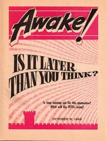 If some evangelicals (and yes, some Catholics,[iii] some Orthodox,[iv] some Adventists, plus the majority of the sects) are known for this sleight of hand, then the Jehovah’s Witnesses have to get the blue ribbon. Their modus operandi is to zero in on the Anxiety of the Day, knock on your door, mention how upset people are about it, and then show how they, the Jehovah’s Witnesses, saw it all coming ahead of time! Exhibit A: this issue of Awake magazine from 1968: “Is it Later than you Think? Is time running out for this generation? What will the 1970’s bring?”