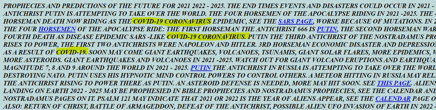 Now – remember that I did this “blindfolded,” without peeking, but let’s see if I can find someone doing this very thing. Just a minute… Okay, I only needed 15 seconds to find a guy who “proves” that Zika was predicted in the Bible, also possibly avian flu and SARS. These are pre-Coronavirus. [vi]