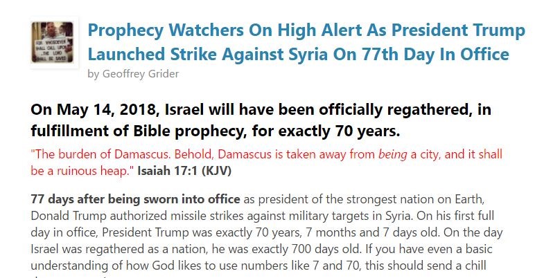 Take any headline from today’s paper, or Time magazine, or YouTube, or your newsfeed, or Facebook, and if you really, really try, I guarantee you’ll be able to find a Bible verse to show how it was predicted long ago. Syria in the news? Just look in the concordance and you will find a verse that fits.