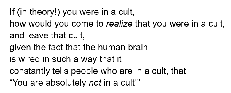 Invitation: if you have ever had even the tiniest sneaking thought, “Am I in a cult?”, it is quite likely that you are. Even if you suspect that there are merely cult-like elements in your group, you may need to examine your commitments. This because, with all the barriers that cult leaders erect on your mind, there is a long delay before any doubt ever will arise. Plus, most cults are well prepared for addressing the occasional twinges of sanity that can creep into its members’ mindset; to give one example, the Jehovah’s Witnesses training in large part consists of how to counter the “lies” they might hear when they knock on a door.