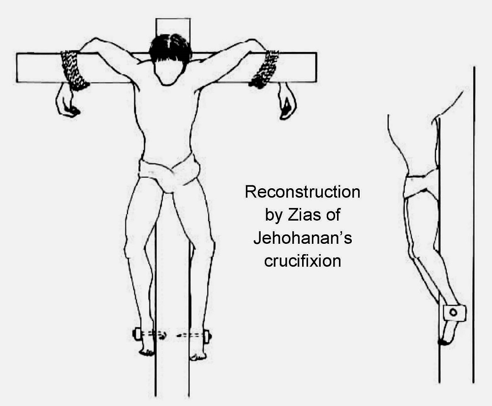 The same historical data help settle the question of whether they crucified them by nailing them or by tying them with rope to the beams. The evidence says that both were possible, and in the case of Yehohanan, who also was crucified in the first century, they nailed his feet but tied his arms with rope. In the case of Jesus, the gospels clearly state that they used nails in his hands; and of they course could have also used ropes on his wrists or arms.