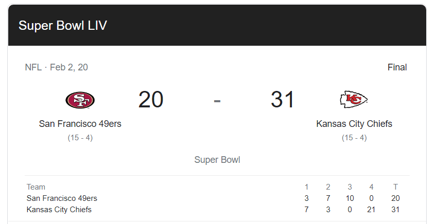 ✓  Superbowl Feb 2 – Kansas City Chiefs beat the San Francisco 49ers 31-20! Fulfilled.