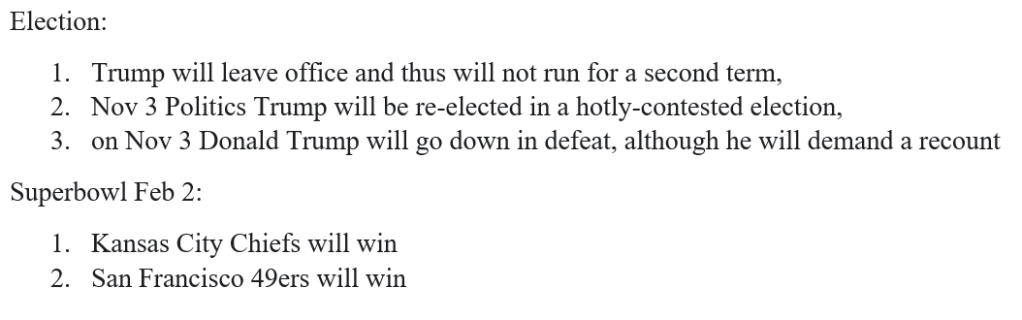 SUPERBOWL – by January 21, 2020, I already knew that Kansas City was going to play in the Superbowl, so I had a 50/50 chance – if I had predicted their victory a few years earlier, it would have been more impressive.
