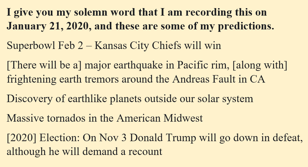 And one factor more! I was entirely honest when I said, I give you my solemn word that I am recording this on January 21, 2020… However – and some of you guessed this already – these were not the only predictions I wrote down. Here is a fuller list, where clearly I was allowing myself breathing space!