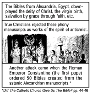 This is a conspiracy theory that certain old manuscripts of the New Testament (principally the codices Sinaiticus and Vaticanus) contain a rewritten gospel. And that therefore, non-KJV Bibles are perversions, not versions, of the Scripture. Chick Publications, who trace every possible evil of our day to the Vatican, nicknamed this the Alexandrian Heresy, a fictional movement unknown in ancient Alexandria but well-known to readers of Chick tracts. (Chick Publications’ David Daniels has taken this one step further into the twilight zone, arguing that Sinaiticus is a modern forgery!)