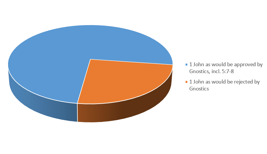 By the way, if someone wants to claim that a Gnostic would cut out the trinitarian verse in 5:7, I propose that it is the preceding material, 5:4b, 5:5, 5:6, that would be truly anathema to a Gnostic, who denies that the Son came as true human, through the elements of water and blood. I would expect to see the paragraph read:
