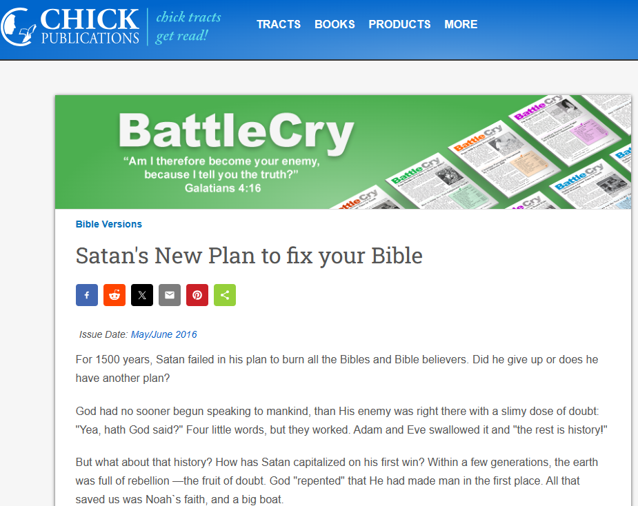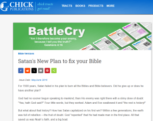 Chick’s website has a page on, “So where was the Bible before 1611?” “Under preparation!” was the (wholly laughably unhelpful) answer. According to this theory, it must be that in the year 300, in 922, in 1111, in 1354, even in 1610 nobody, not one person around the world, not one person, had access to God’s Word. (A side note: my 11-times great grandfather-preacher was twice imprisoned because of his insistence on all Christians hearing the sound preaching of the Bible. Imagine my astonishment upon hearing this novel doctrine, according to which he HAD no Bible! He was arrested for his preaching in the 1500s and died just before the King James was published! The Pilgrims landed in Plymouth, but did not carry the KJV. Tyndale was executed for first translating the Bible into English – but oops, he couldn’t have died for God’s Word, which supposedly came out 75 years after his death!). Can you see why I find this a contradiction of their doctrine of the “divine preservation” of the Bible? If God did not preserve it until 1611?