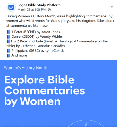 In March, Logos placed a joyful announcement on their Facebook page, featuring Bible commentaries written by “women who wield words for God’s glory.” Out of the ones they highlighted, I had just used Karen Jobes’s commentary to help translate a passage in 1 Peter, to great benefit; not to mention the help I have gotten from her world-class material on the Septuagint.